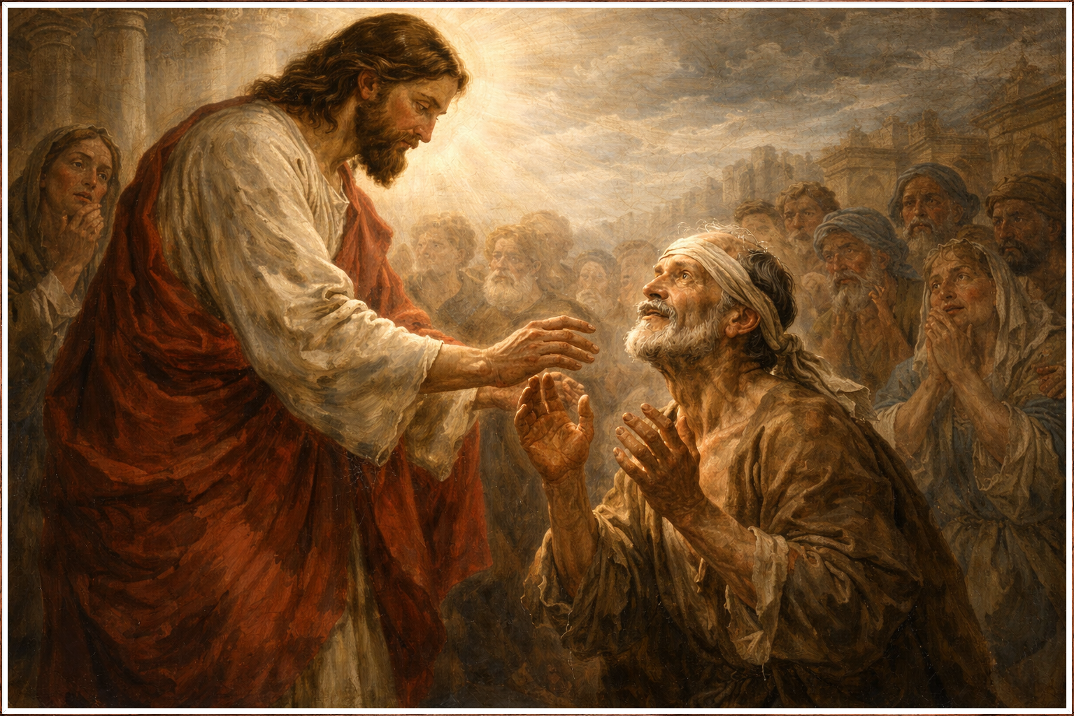 Nel Vangelo Gesù incontra un uomo cieco dalla nascita e lo guarisce. I discepoli pensano che la sua cecità sia conseguenza del peccato, ma Gesù rivela che attraverso di lui si manifesteranno le opere di Dio. Dopo aver obbedito alla parola di Gesù e lavatosi alla piscina di Siloe, l’uomo torna vedendo.