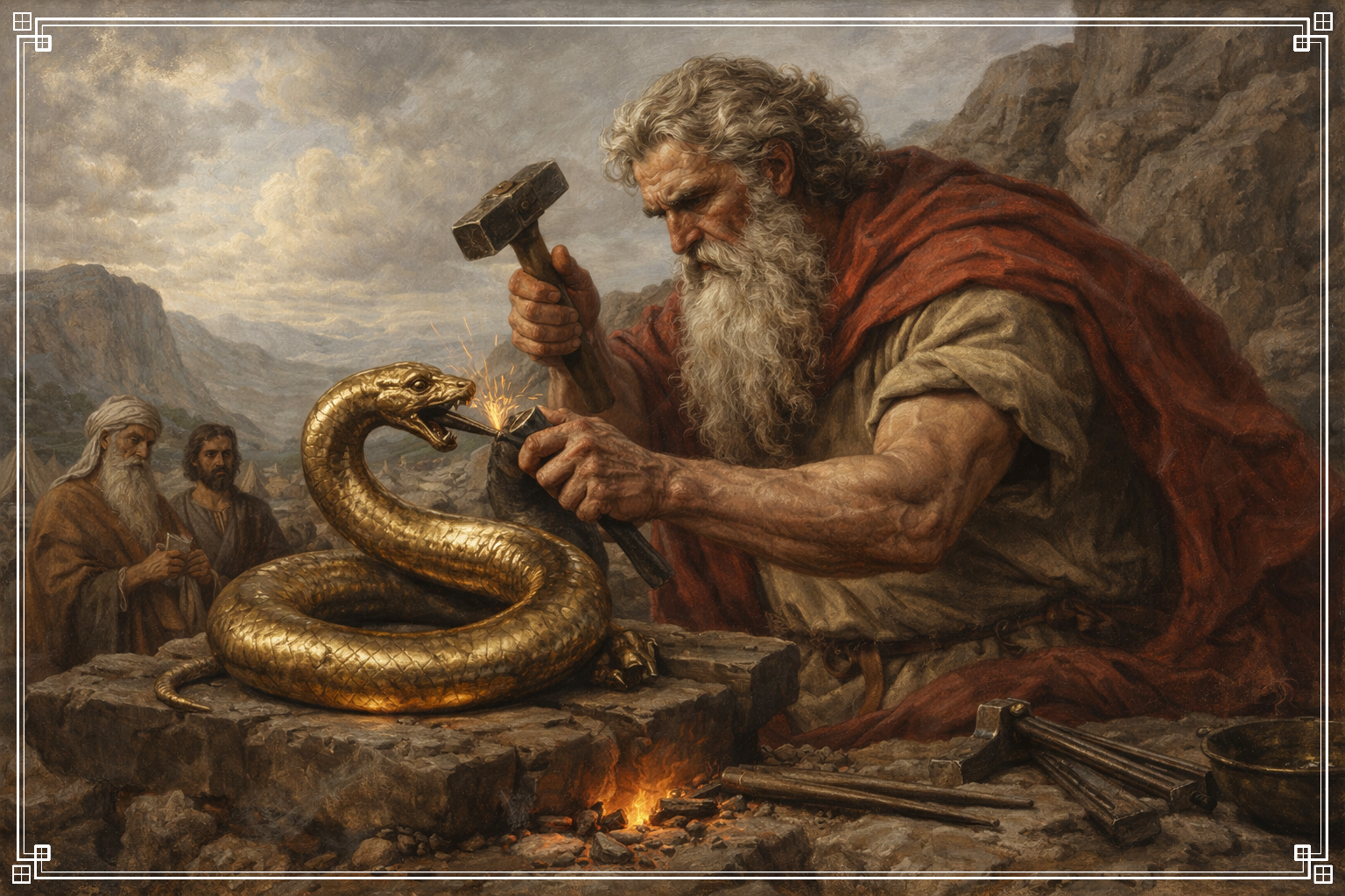 In punishment, the Lord sent among the people seraph serpents which bit the people, so that many of them died. And so God commanded Moses to make a seraph and mount it on a pole, and whoever looks at it after being bitten will live. “Moses accordingly made a bronze serpent and mounted it on a pole; and whenever anyone who had been bitten by a serpent looked at the bronze serpent, he lived” (Numbers 21:9).